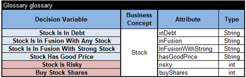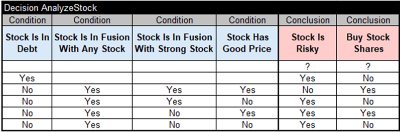 It has 4 input variables and two output variables “Stock Is Risky” and “Buy Stock Shares” with possible values “1” for Yes, “0” for No.