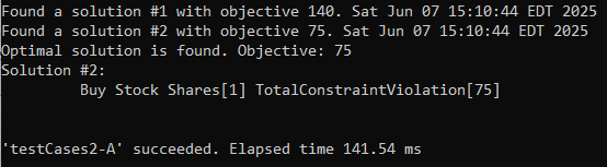 As you can see, the final (“optimal”) solution was also found from the second attempt. The total constraint violation is now 75, which corresponds to the violated first constraint “Risky” with Probability=HIGH (with an internal value 75).