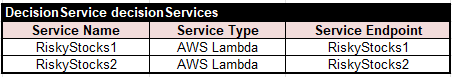To let this decision model know about our two services, I described them in the following table of the type “DecisionService”: