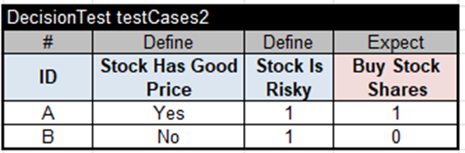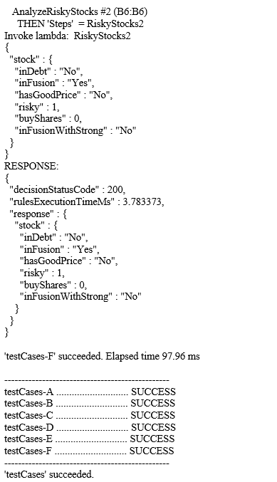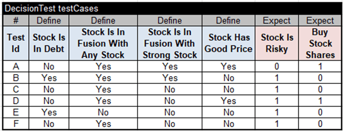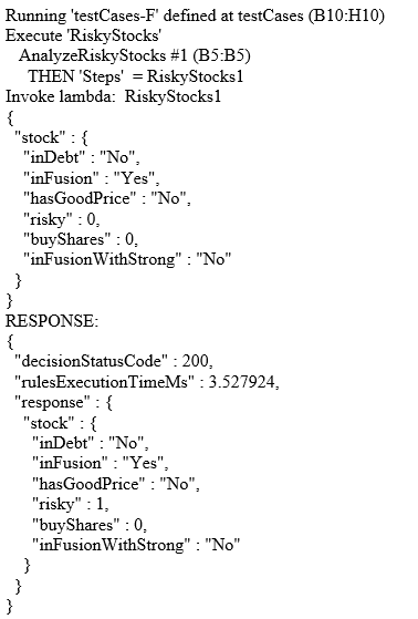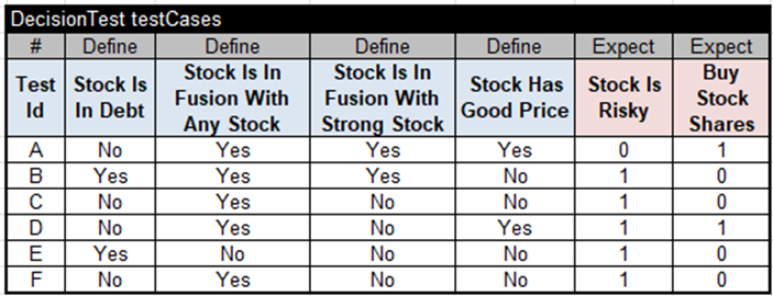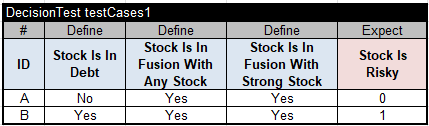 Here, I assumed that the variable “Stock Is Risky” in the second Condition has already been defined by the previous service and came to this service as a regular input variable. This decision model is completed, and here are the test cases for its execution: