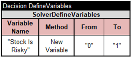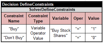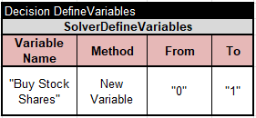 This service uses the same two main tables “Define” and “Solve” as the previous service. It needs only one unknown variable, “Buy Stock Shares”, with possible values “0” or “1”: