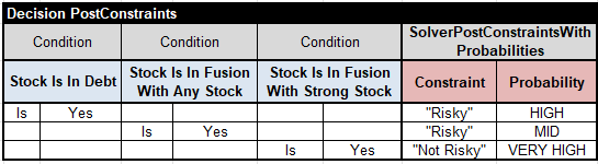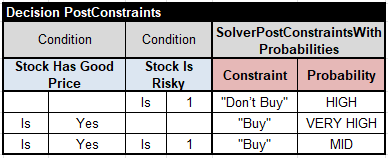 Keeping these considerations in mind, I will share here a completely different approach that I applied to this simple challenge, but a similar approach can also be applied to much more complex real-world trading applications. When we applied a similar approach years ago, our implementation used a constraint solver and required good programming skills. This time, I will use a special OpenRules decision engine called Rule Solver. It supports Rules/Constraints with Probabilities and was designed for business analysts without programming skills.