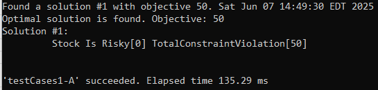 As you can see, the final (“optimal”) solution was found from the first attempt. The total constraint violation is 50, which corresponds to the violated second constraint “Risky” with Probability=MID (with an internal value 50).