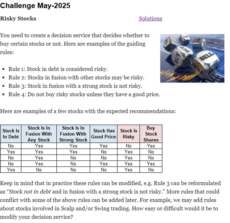 Let’s look at the above 4 rules of the Challenge. The first 3 rules specify the conditions when a stock may be risky. Rule 4 specifies when to buy or not to buy a stock. Considering that all these rules can be expanded with more rules down the road (the Challenge mentions Scalp and Swing trading), it makes sense to create two separate decision services: