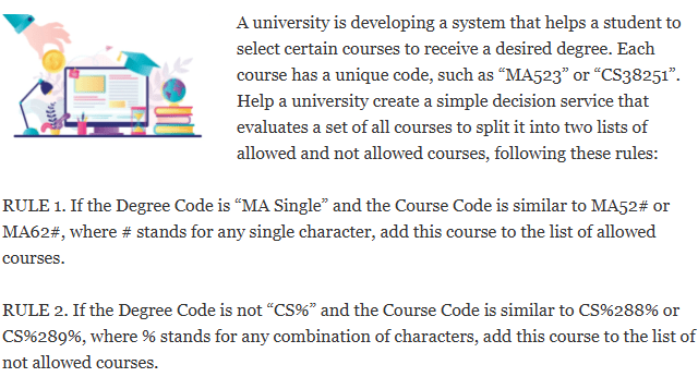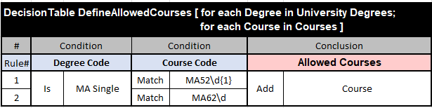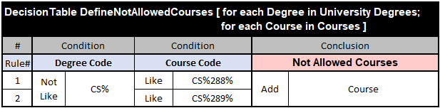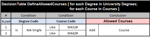 Let’s assume that we need to iterate over the array “University Degrees” of the type Degree[] and the array “Courses” of the type Course[] and apply the above rules to define two other arrays: “Allowed Courses” and “Not Allowed Courses” of the type Course[]. Here are the proper rules in the OpenRules format: