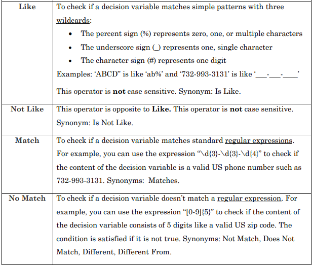 OpenRules supports regular expressions inside the conditions of its decision tables using different variations of the predefined operators “Like” and “Match”: