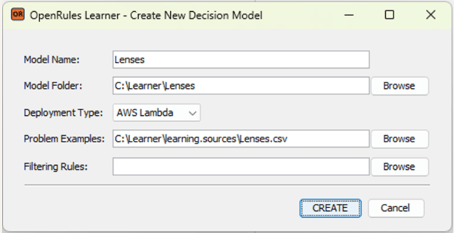 After a click on the button “CREATE”, Rule Learner will generate the proper decision model (in this case “Lenses” inside the folder “C:\Learner\Lenses”), which typically contains the following components: