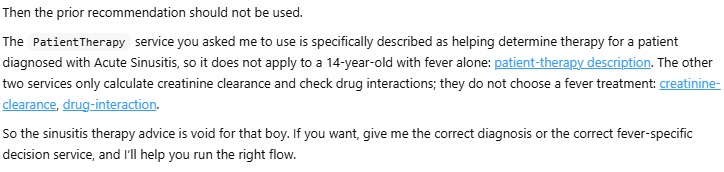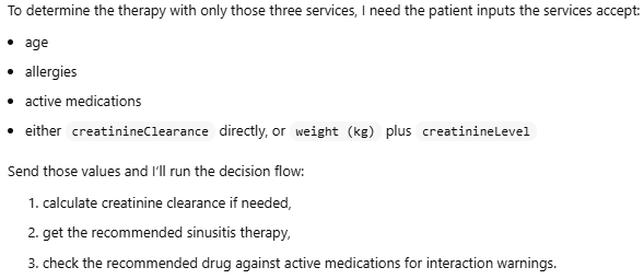 Tell your LLM to use these three decision services when answering any therapy request for a patient with Acute Sinusitis. Here is a possible request: