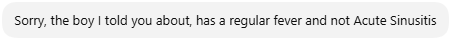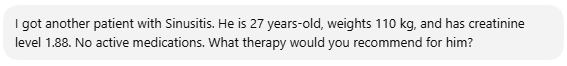 To illustrate, consider the following dialogue with ChatGPT, in which it plays the role of a physician determining the appropriate therapy for different patients diagnosed with Acute Sinusitis.