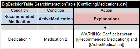 If it finds the pair “RecommendedMedication – ActiveMedication” in the CSV file “ConflictingMedications.csv”, it adds the appropriate warning to the “Explanations” array. Note that we use a table of type “BigDecisionTable“, which guarantees fast search even for files with hundreds of thousands of records.