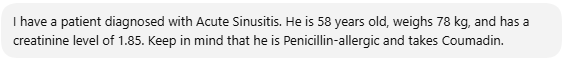 “I have a patient diagnosed with Acute Sinusitis. He is 58 years old, weighs 78 kg, and has a creatinine level of 1.85. Keep in mind that he is Penicillin-allergic and takes Coumadin.“