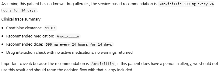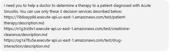 Tell your LLM to use these three decision services when answering any therapy request for a patient with Acute Sinusitis. Here is a possible request: