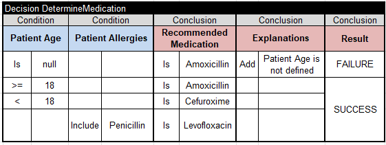 If it finds the pair “RecommendedMedication – ActiveMedication” in the CSV file “ConflictingMedications.csv”, it adds the appropriate warning to the “Explanations” array. Note that we use a table of type “BigDecisionTable“, which guarantees fast search even for files with hundreds of thousands of records.
