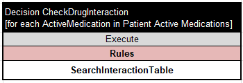 For each ActiveMedication it executes the decision table “SearchInteractionTable”:
