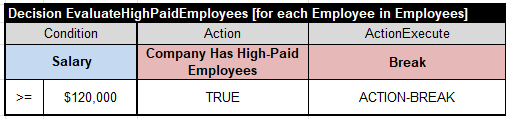 Iterating over collections (arrays) of decision variables is a frequent need in real-world decision models. For example, the following decision table defines if a company has high-paid employees: