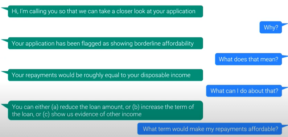 Note. During DecisionCAMP two presenters considered the similar business problem discussing how to provide explanations for why a loan request was rejected. Greg Ottosson said it is not acceptable to offer a user (such as a loan borrower) the “try-and-fail” asking him/her to try different combinations of loan amounts and terms. Alan Fish even offered to implement the following conversation: