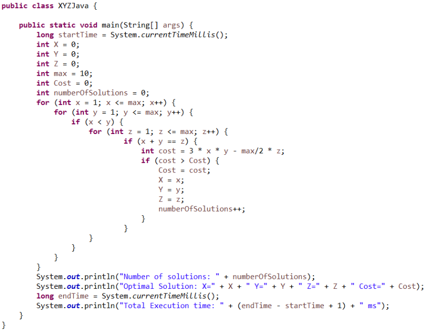 There are 3 variables X, Y, and Z that can take values from 1 to 10 (or a larger number). We know that X < Y and X+Y=Z. We need to find their values that maximize the Cost = 4XY – 5Z.