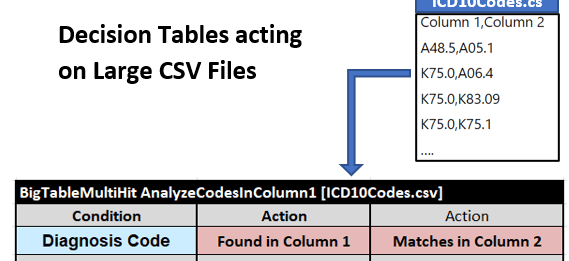 Like a regular DecisionsTable, the table of the type “BigTable” by default is a single-hit table. However, you may use BigTableMultiHit to accumulate some values. For example, our sample project “ICD10” compares medical claim diagnosis codes with some incompatible codes described in this file “ICD10Codes.csv”: